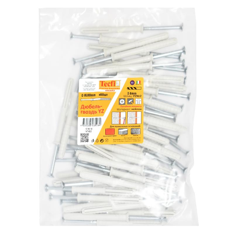 Дюбель-гвоздь YZ потайн. манжета нейлон 8x80 (60 шт)- пакет | 147493 | Tecfi