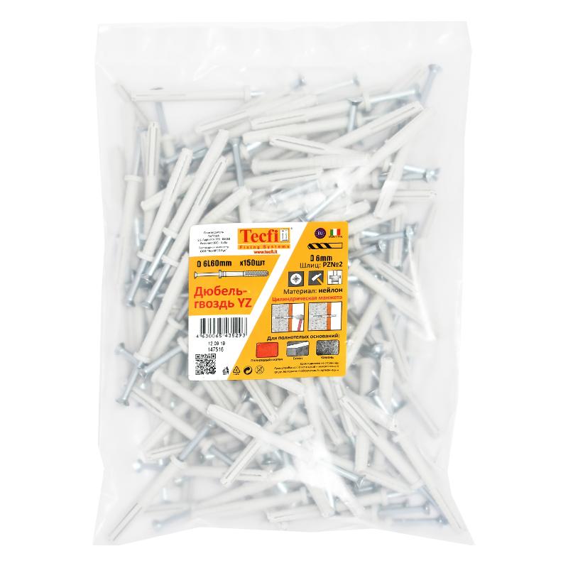 Дюбель-гвоздь YZ цилиндр. манжета нейлон 6x60 (150 шт)- пакет | 147516 | Tecfi