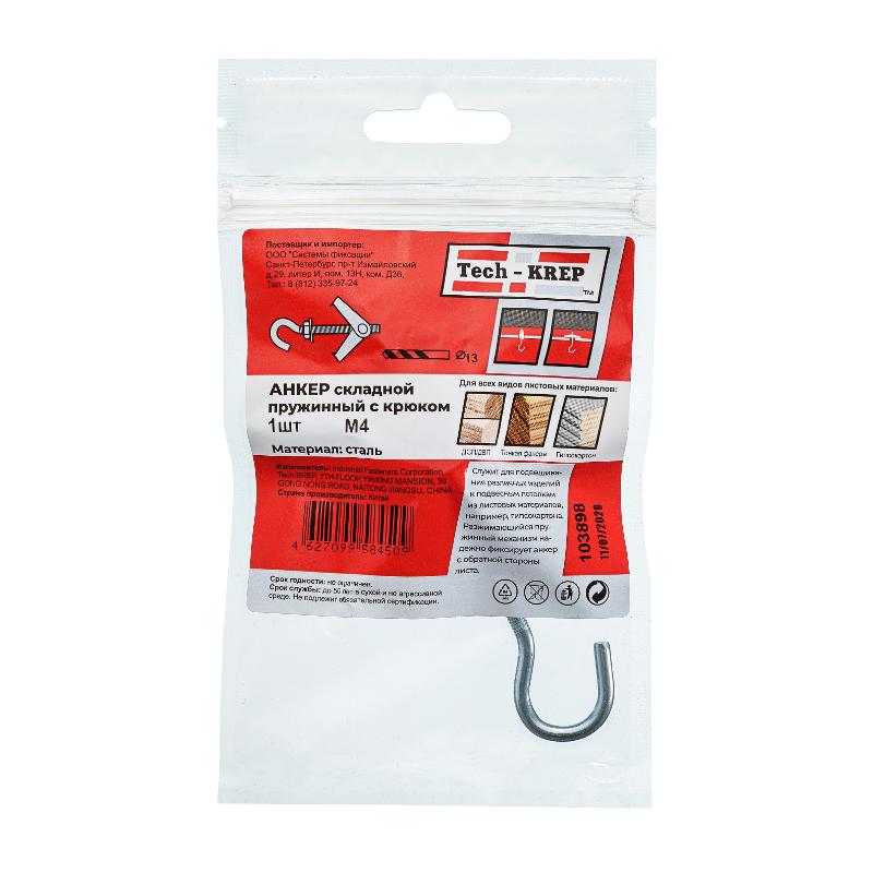 Анкер складной пружинный с крюком М4 (1 шт) - пакет ( 0,016 кг) | 103898 | Tech-KREP