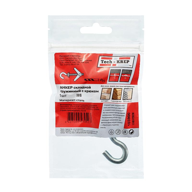 Анкер складной пружинный с крюком М6 (1 шт) - пакет ( 0,037 кг) | 103900 | Tech-KREP