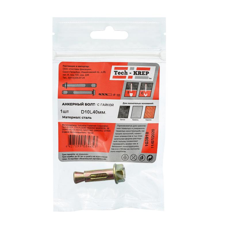 Анкерный болт с гайкой 10х40 (1 шт) - пакет ( 0,028 кг) | 103918 | Tech-KREP