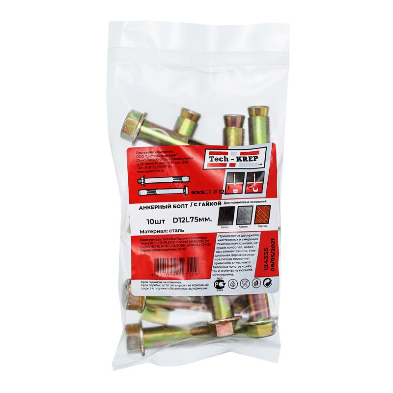 Анкерный болт с гайкой 12х75 (10 шт) - пакет ( 0,619 кг) | 124335 | Tech-KREP
