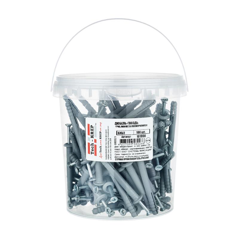 Дюбель-гвоздь 6х60 гриб. манжета (полипропилен) (100 шт) - ведро ( 0,53 кг) | 101990 | Tech-KREP