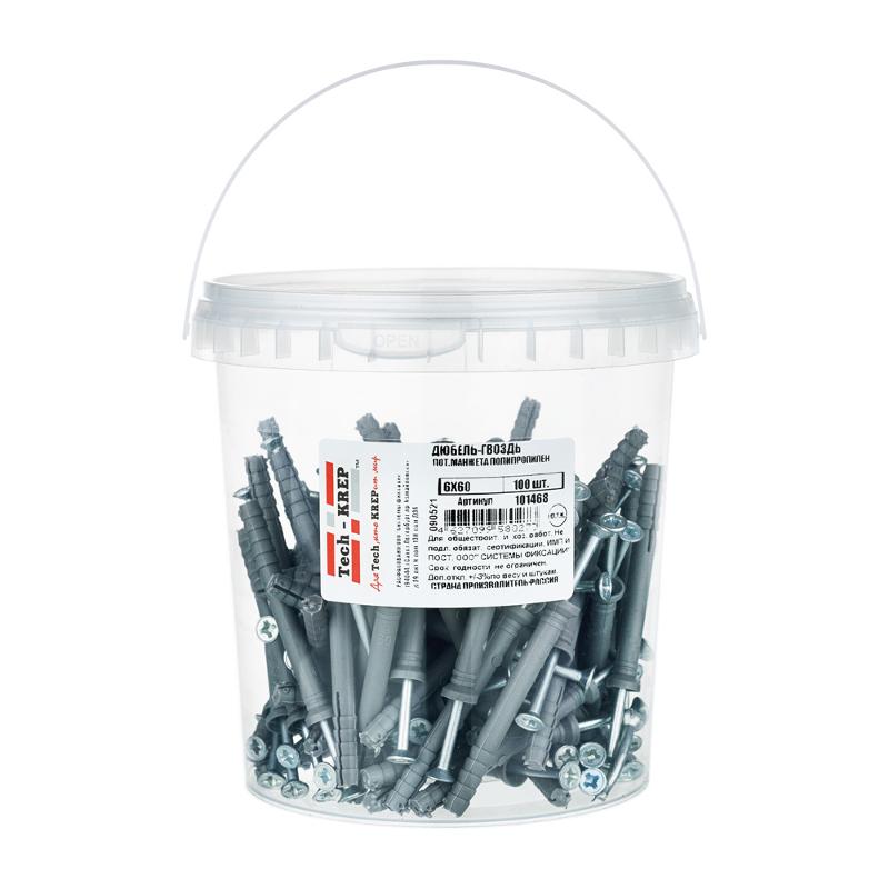 Дюбель-гвоздь 6х60 пот. манжета (полипропилен) (100 шт) - ведро ( 0,53 кг) | 101468 | Tech-KREP