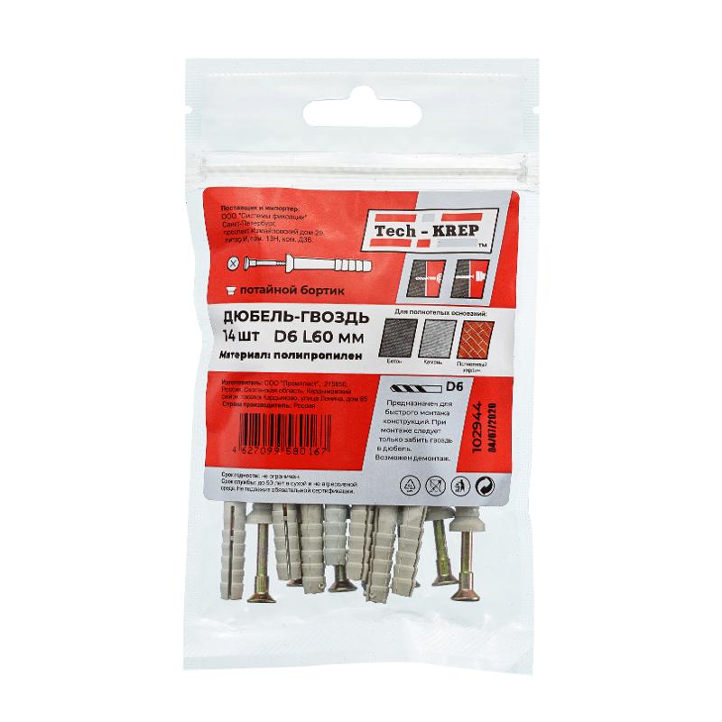 Дюбель-гвоздь 6х60 пот. манжета (полипропилен) (14 шт) - пакет ( 0,071 кг) | 102944 | Tech-KREP