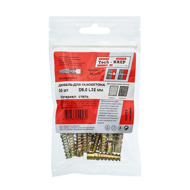 Дюбель для газобетона 6х32 (30 шт) - пакет ( 0,079 кг) | 111113 | Tech-KREP