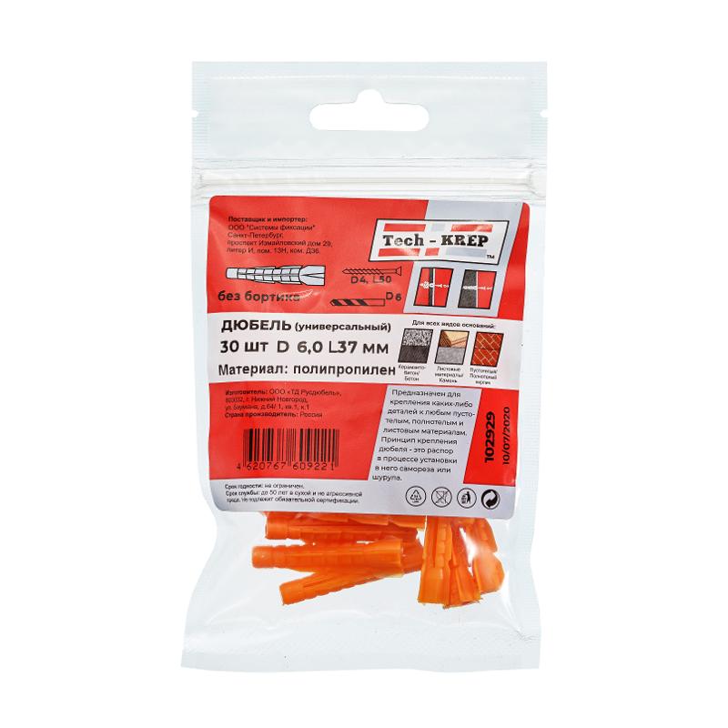 Дюбель универсальный 6х37 без бортика (30 шт) - пакет ( 0,025 кг) | 102929 | Tech-KREP