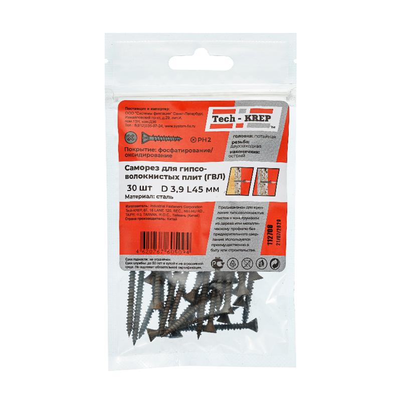Саморез ШС ГВЛ 3,9х45 (30 шт) - пакет ( 0,07 кг) | 112708 | Tech-KREP