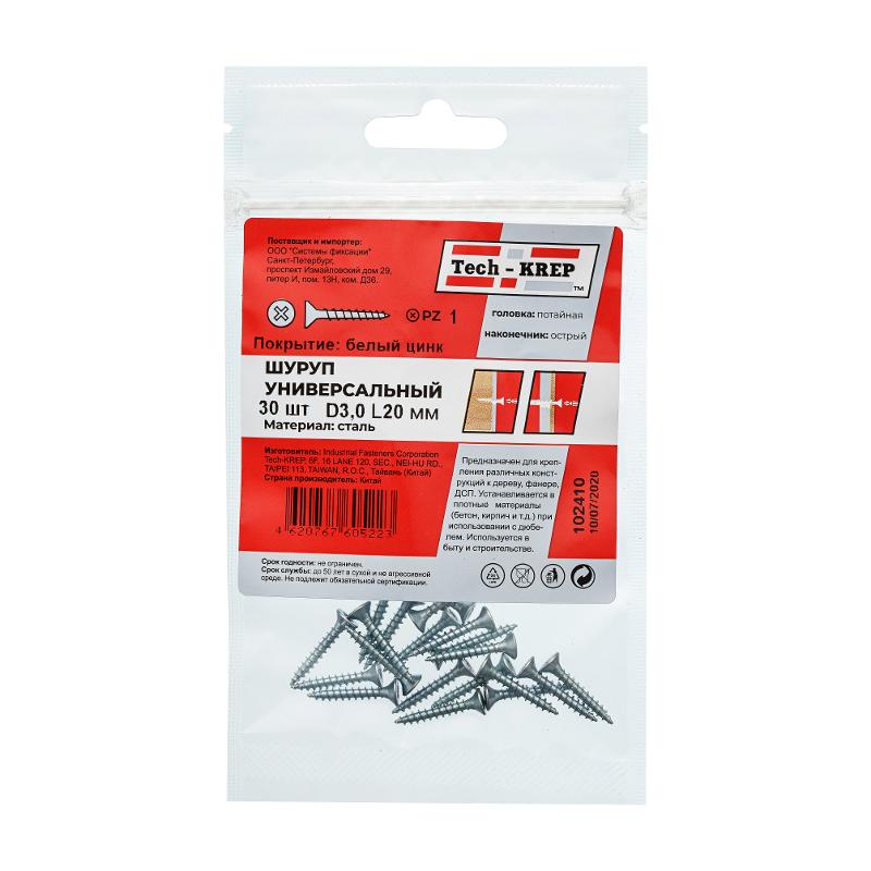 Саморез ШУц 3,0х20 пот. гол. (30 шт) - пакет ( 0,023 кг) | 102410 | Tech-KREP