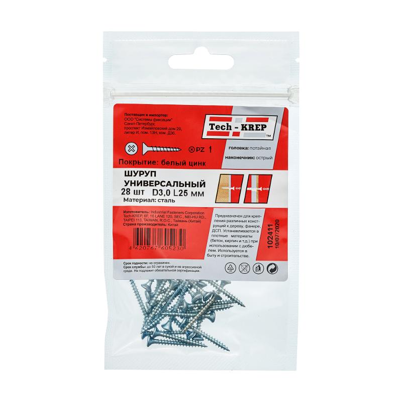 Саморез ШУц 3,0х25 пот. гол. (28 шт) - пакет ( 0,025 кг) | 102411 | Tech-KREP