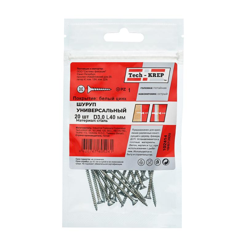 Саморез ШУц 3,0х40 пот. гол. (20 шт) - пакет ( 0,025 кг) | 102414 | Tech-KREP