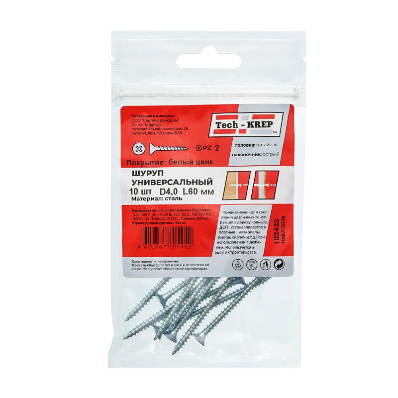 Саморез ШУц 4,0х60 пот. гол. (10 шт) - пакет ( 0,033 кг) | 102433 | Tech-KREP