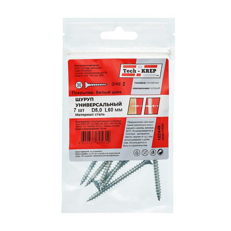 Саморез ШУц 5,0х60 пот. гол. (7 шт) - пакет ( 0,037 кг) | 102449 | Tech-KREP