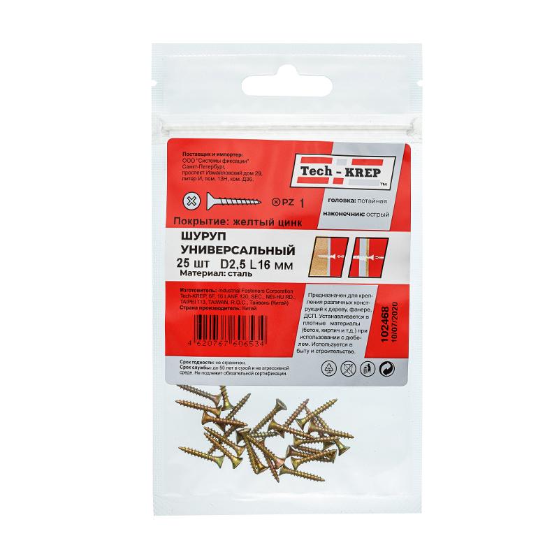 Саморез ШУж 2,5х16 пот. гол. (25 шт) - пакет ( 0,013 кг) | 102468 | Tech-KREP