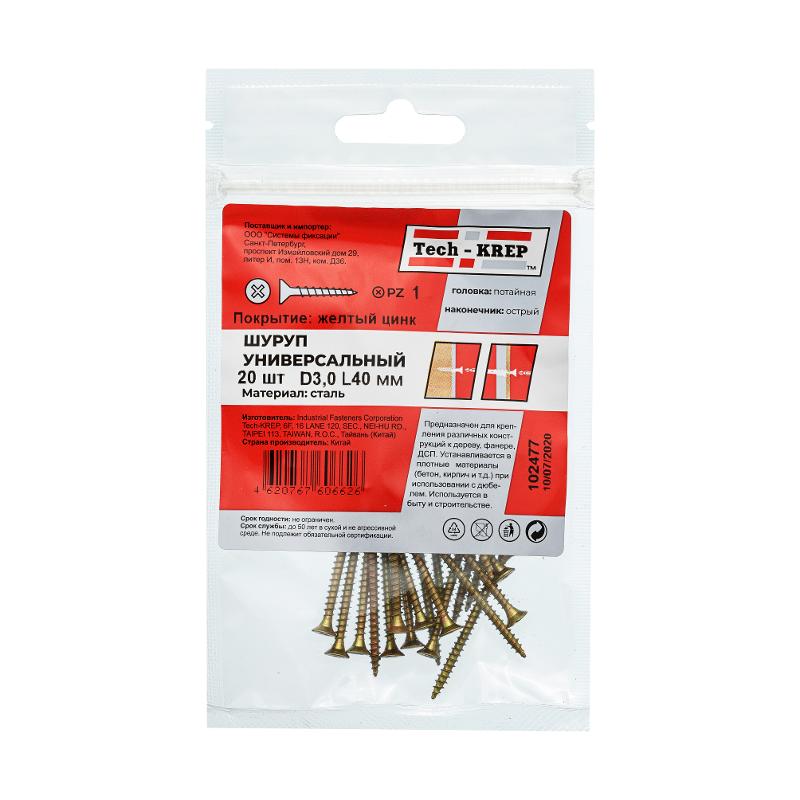 Саморез ШУж 3,0х40 пот. гол. (20 шт) - пакет ( 0,027 кг) | 102477 | Tech-KREP