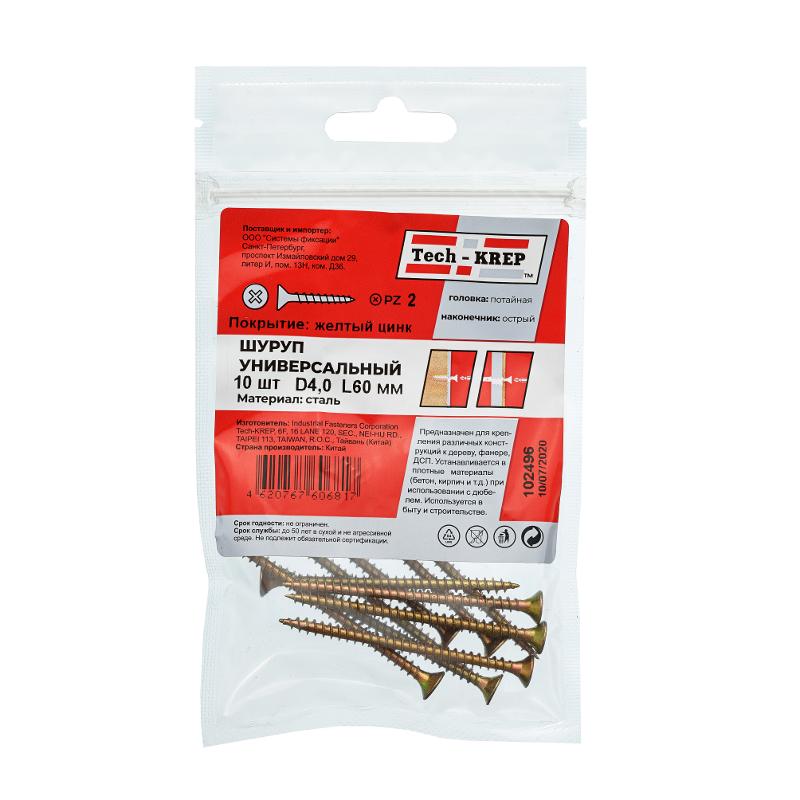 Саморез ШУж 4,0х60 пот. гол. (10 шт) - пакет ( 0,032 кг) | 102496 | Tech-KREP