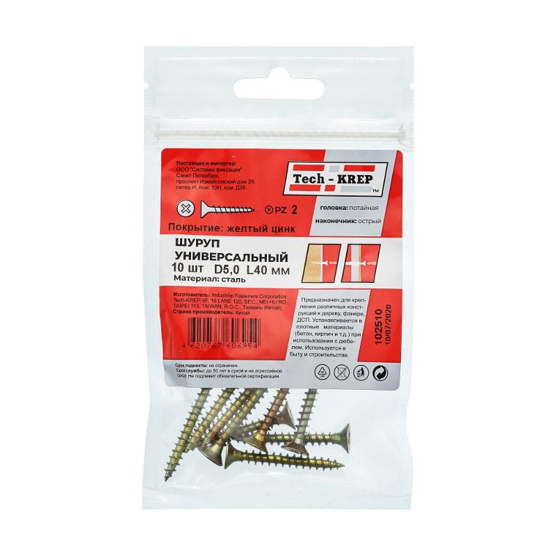 Саморез ШУж 5,0х40 пот. гол. (10 шт) - пакет ( 0,035 кг) | 102510 | Tech-KREP