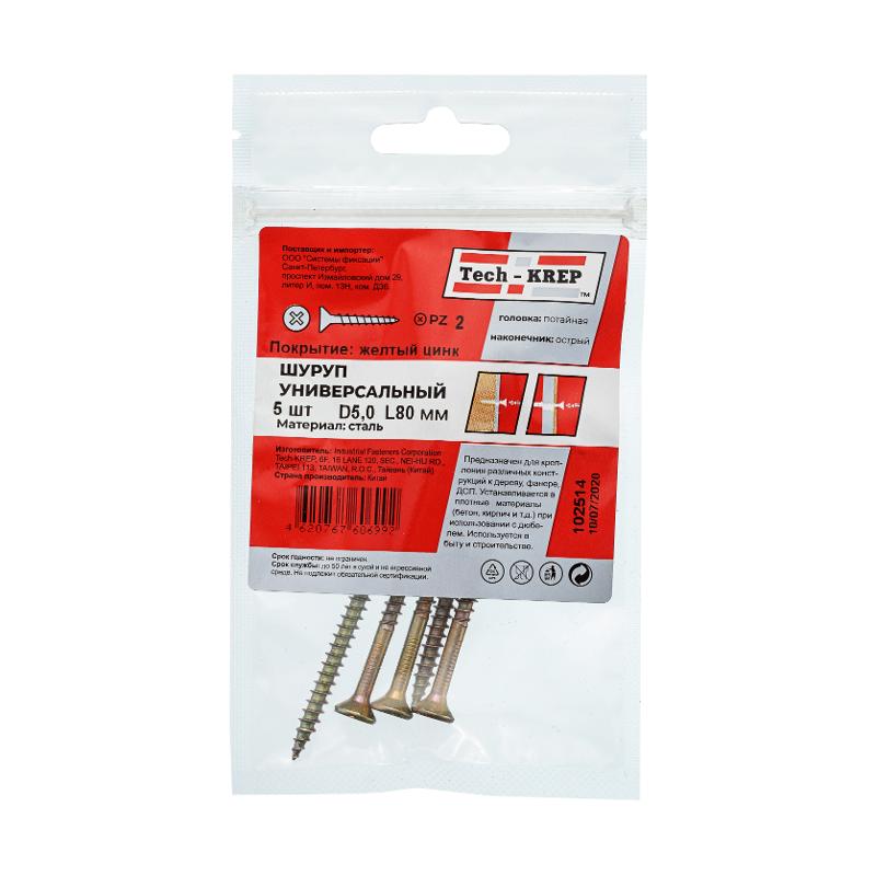 Саморез ШУж 5,0х80 пот. гол. (5 шт) - пакет ( 0,033 кг) | 102514 | Tech-KREP