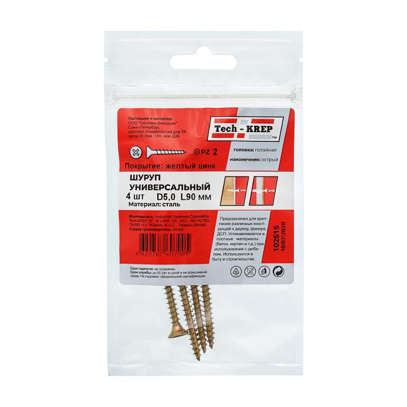 Саморез ШУж 5,0х90 пот. гол. (4 шт) - пакет ( 0,031 кг) | 102515 | Tech-KREP