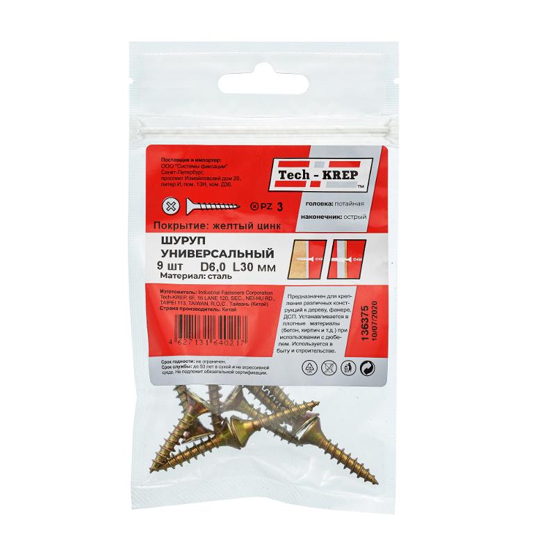 Саморез ШУж 6,0х30 пот. гол. (9 шт) - пакет ( 0,037 кг) | 136375 | Tech-KREP