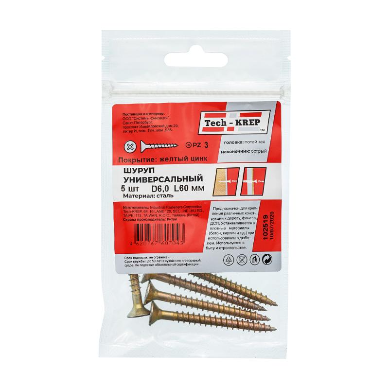 Саморез ШУж 6,0х60 пот. гол. (5 шт) - пакет ( 0,037 кг) | 102519 | Tech-KREP
