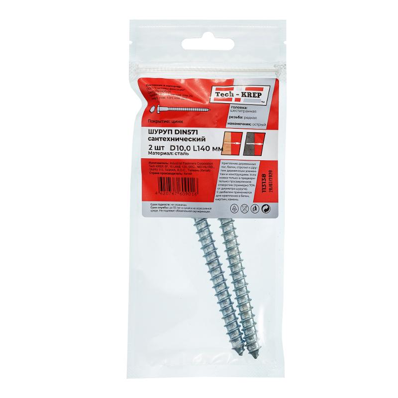 Болт DIN 571 сантехнический оцинк 10х140 (2 шт) - пакет ( 0,141 кг) | 113138 | Tech-KREP
