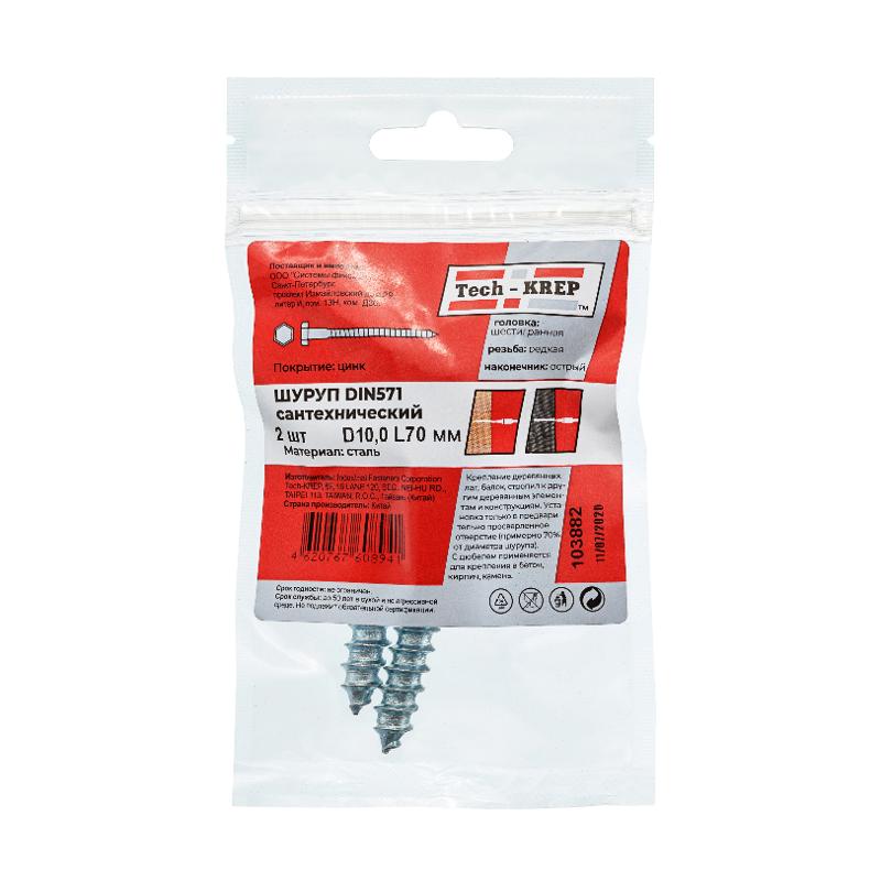 Болт DIN 571 сантехнический оцинк 10х70 (2 шт) - пакет ( 0,074 кг) | 103882 | Tech-KREP