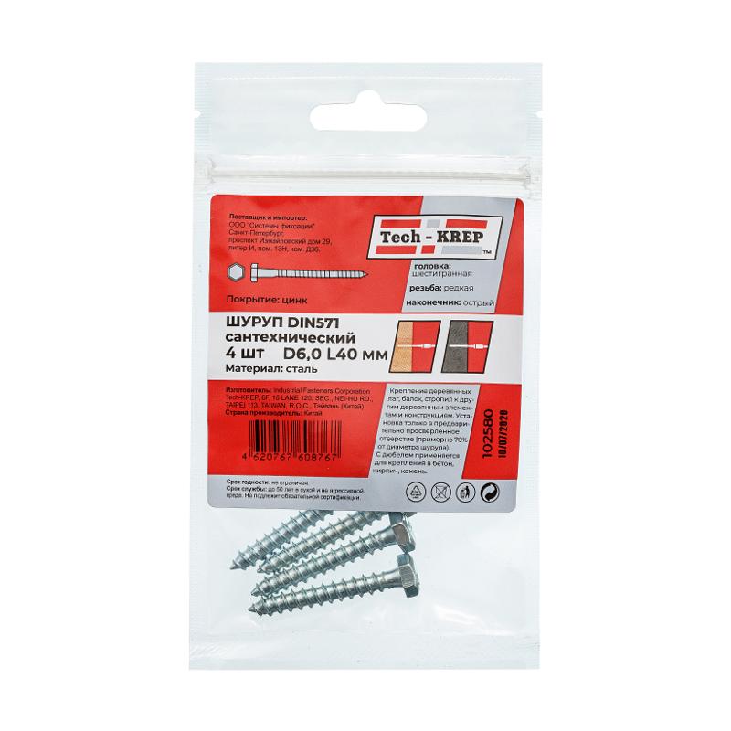 Болт DIN 571 сантехнический оцинк 6х40 (4 шт) - пакет ( 0,033 кг) | 102580 | Tech-KREP
