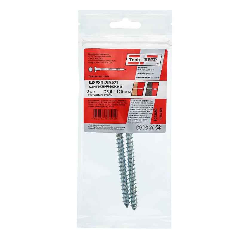 Болт DIN 571 сантехнический оцинк 8х120 (2 шт) - пакет ( 0,075 кг) | 103880 | Tech-KREP