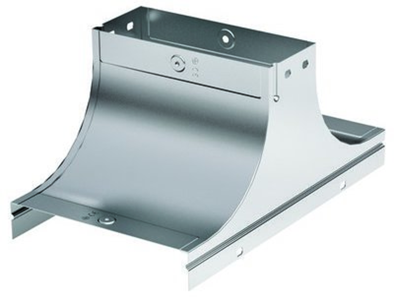 Ответвители – это аксессуары, облегчающие построение кабельных трасс сложной геометрии, с поворотами и изгибами. Они позволяют создавать ответвления кабельной трассы. Ответвитель TS имеет Т-образную форму и применяется для организации ответвлений в вертикальной плоскости. Его конструктив обеспечивает плавный поворот и предупреждает повреждение кабеля при прокладке. При применении вместе с крышкой обеспечивается высокая степень пыле- и влагозащиты кабеля – до IP 44, и простой доступ к кабелю, т.к. крышку можно снять при необходимости. Высота боковой стенки лотка – 80 мм, ширина в горизонтальном направлении – 500 мм, ширина в вертикальном направлении – 500 мм.