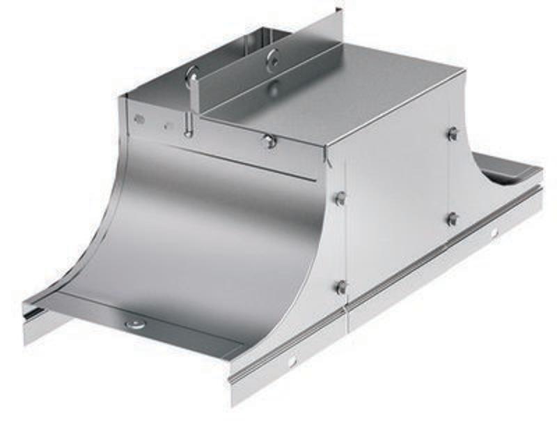 При построении кабельной трассы чаще всего требуется организовать ее изгибы и ответвления в горизонтальной и/или вертикальной плоскости. Для этого в системе "S5 Combitech" применяются аксессуары. Крышка-ответвитель TSS используется, если нужно организовать сложное ответвление кабельной трассы. Она имеет Т-образную форму. При ответвлении обеспечивается плавный изгиб, что предохраняет кабель от повреждения. Ширина лотка в горизонтальном направлении – 100 мм, в вертикальном – 100 мм, высота боковой стенки – 50 мм.