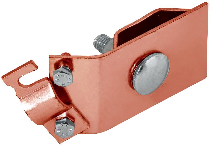 Держатель проводника круглого 6-10мм для водосточного желоба предназначен для крепления круглых проводников на водосточный желоб. Крепление осуществляется при помощи болтового соединения. Материал корпуса - медь.