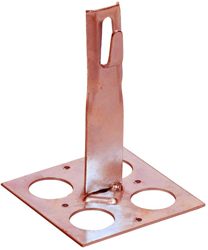 Держатель проводника круглого для плоской кровли с болтовым зажимом предназначен для закрепления прутка на плоской или наклонной кровле. Держатель крепится к кровле при помощи клея. Зажим проводника происходит путем загибания «язычка» держателя. Материал корпуса - медь.