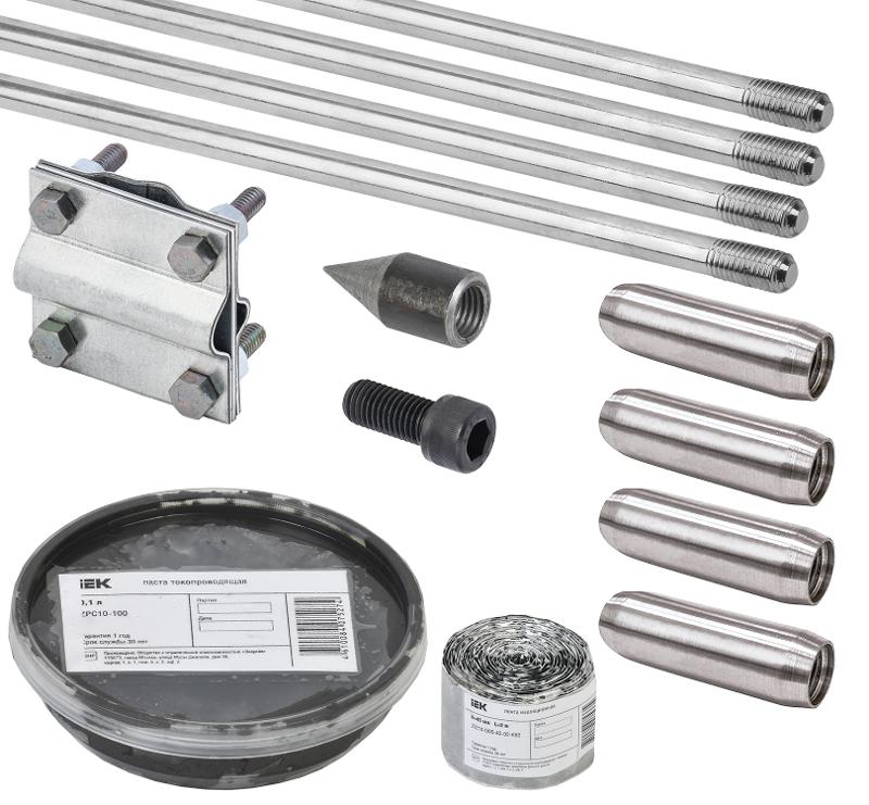 Комплект заземления товарного знака IEK используется для организации заземляющего устройства жилых объектов, объектов энергетического и промышленного комплексов, объектов связи. Данный комплект монтируется на глубину 6 метров путём последовательного соединения и заглубления стержней с помощью перфоратора или кувалды.