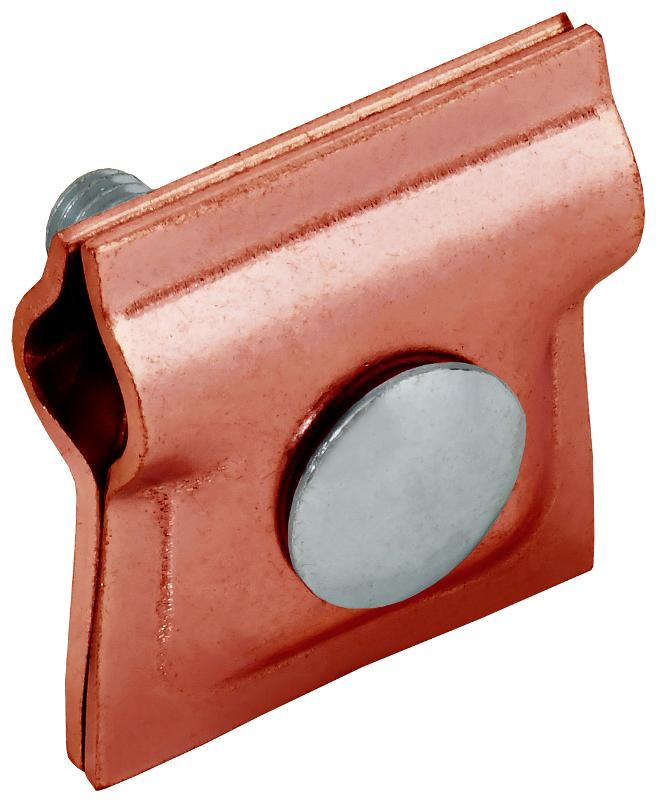 Крепится к кровле при помощи метизов. Зажим проводника происходит при помощи болтового соединения. Материал корпуса - медь.