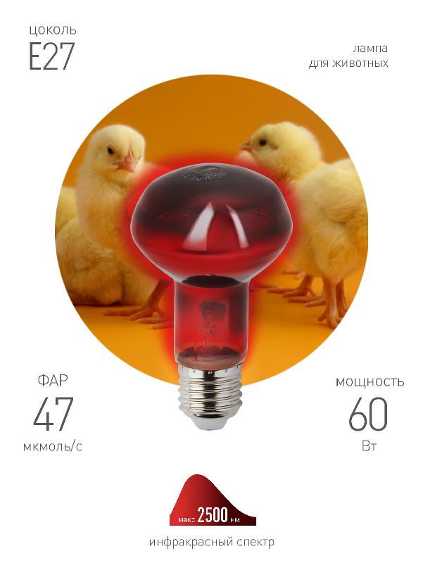 Инфракрасная лампа ИКЗК 230-60 R63 Е27 для обогрева животных 60 Вт Е27 | Б0057281 | ЭРА