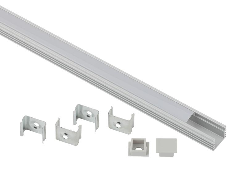 Комплект накладного алюминиевого профиля предназначен для установки светодиодных лент с шириной подложки до 10 мм. За счёт отведения тепла увеличивает срок службы светодиодной ленты. Покрытие из порошковой краски обеспечивает устоичивость к воздействиям окружающей среды. Эстетично смотрится в интерьере, обеспечивает механическую защиту. В комплекте накладной алюминиевый профиль САВ262 16х12 мм 2 м, белый матовый экран из поликарбоната 2 м, 4 крепления и 2 заглушки.