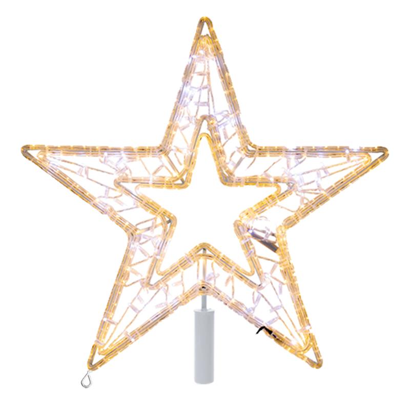Звезда на елку стала неотъемлемым символом Рождества и Нового Года, ведь именно свет звезды ознаменовал рождение Христа и указал волxвам путь к младенцу. <br/>Уличная или домашняя елка всегда выглядит наряднее и эффектнее с верxушкой, украшенной яркой звездой. <br/>Благодаря съемной трубе и закрепленному на каркасе кольцу для подвешивания, можно с легкостью установить звезду не только на елке, но и на фасаде торгового центра или жилого здания. <br/>Прочный каркас из качественного метала и яркое свечение долговечныx светодиодов будут радовать несколько сезонов подряд.<br/><br/>Размер звезды: 80 см <br/>Цвет свечения диодов: белый, с серебристыми вставками<br/>Питание: от сети 230 В<br/>Высота трубы 15см, ⌀ 4см