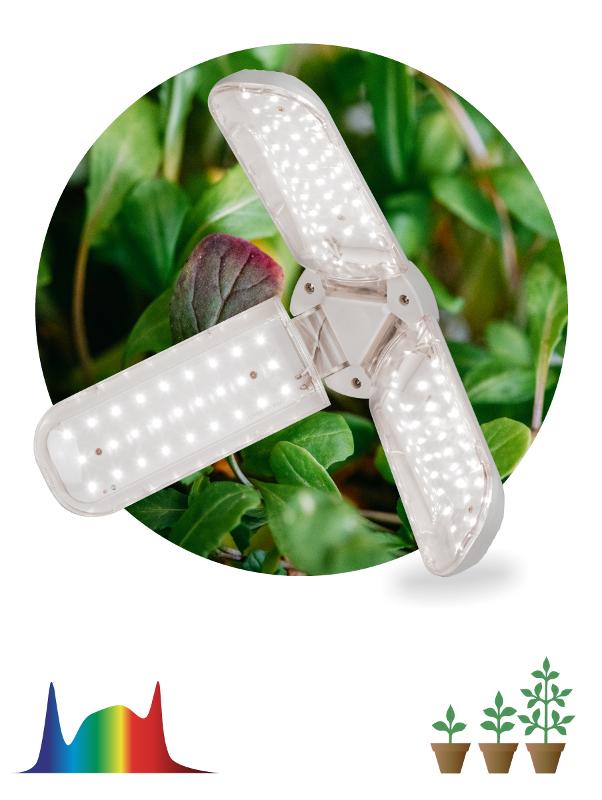 Эта удобная бытовая фитолампа-трансформер полного спектра по своей мощности и эффективности не уступает профессиональному фитопрожектору. Обеспечивает качественную досветку 2 кв м рассады. Мягкий белый свет комфортен для глаз человека. Поворотные лепестки позволяют быстро и без усилий изменить направление и интенсивность освещения конкретных растений. Эффектный внешний вид и максимальный комфорт в применении. На каждом лепестке по 27 светодиодов. Каждый лепесток поворачивается на 180 градусов. Индивидуальное регулирование наклона и направления светодиодных "лепестков" дает возможность создать множество уникальных сценариев подсветки растений.