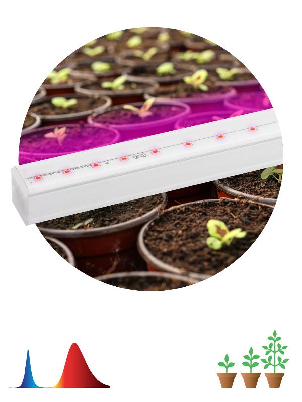 Светильник для растений ЭРА FITO-9W-Т5-N для выращивания зелени, рассады пасленовых, а также для досвечивания комнатных цветов. Спектр свечения светильника фиолетовый со сдвигом в розовую часть; соотношение синего к красному - 2 к 3. Сдвиг в область красного с добавлением свечения в области дальнего красного позволяет светильнику обеспечить питание корням и листьям и предотвратить вытягивание растений. Данная модель отличается прозрачным рассеивателем, крепким корпусом с хорошим теплоотводом. Диоды в светильнике работают в дефорсированном режиме, что обеспечит долгий срок службы и хорошую светоотдачу. Рекомендованное расстояние от светильника - не более 35 см до листьев растений. Минимальное расстояние - 5 см. Подвес светильника легко регулировать по высоте с помощью бечевки и комплекта скоб. Мощность светильника рассчитана на площадь подоконника соответствующей длины.